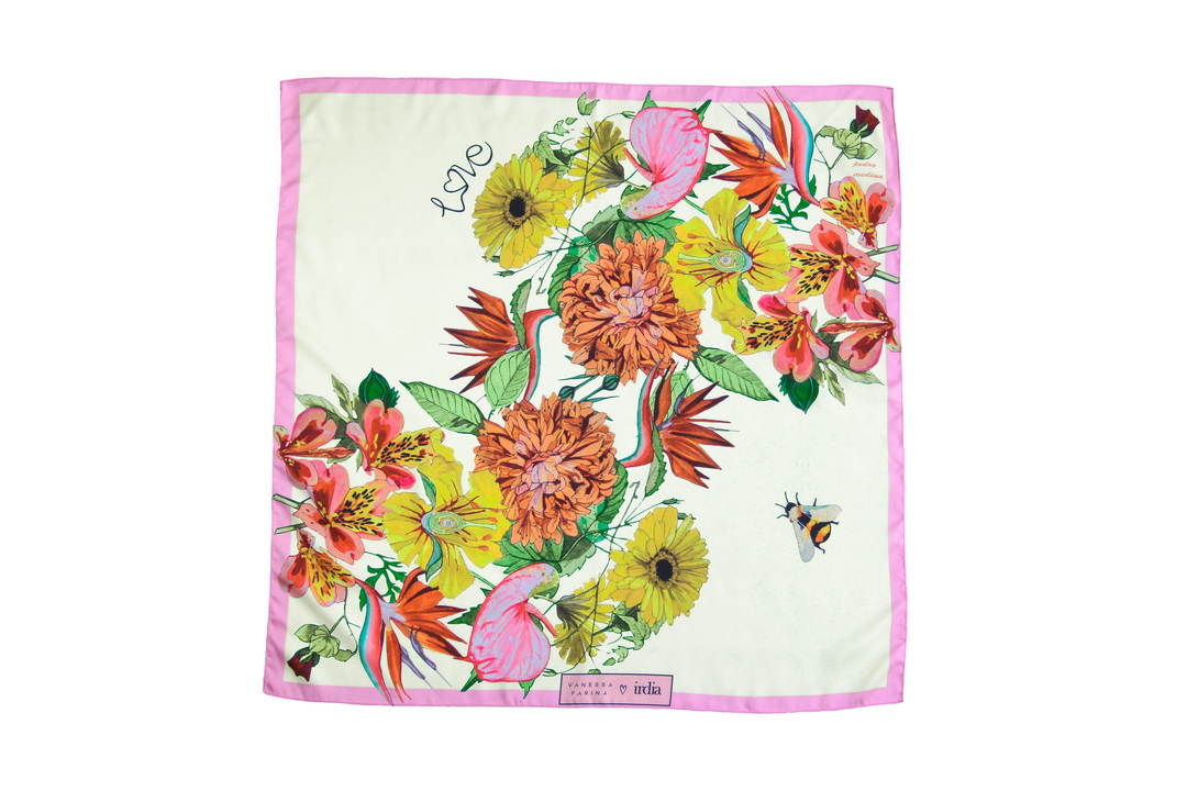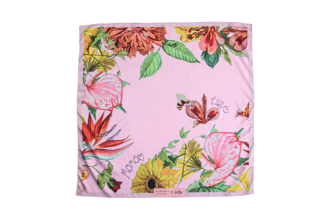 Pañuelo de la colaboración Floral Romance de Vanessa Farina + Irdia con acabado de seda. Acuarelas de flores del artista plástico Pedro Medina inspirado en los momentos únicos que queremos llevar siempre en nuestros corazones a través de una pieza especial.